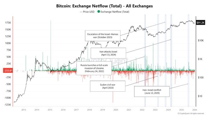 Умные головы из XWIN Research, крипто-аналитического центра, базирующегося в Японии, тщательно изучили этот вопрос. Они исследовали, как ведут себя чистые потоки средств на биржах биткоинов во время геополитических махинаций. Их вердикт? Дорогая, все довольно предсказуемо. 🕵️♂️